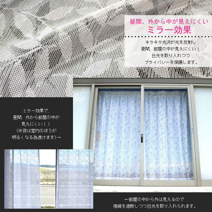 詳しいご利用方法はこちらまで 関連商品【ミラー効果】 裏面に光沢のある糸を使用することで、 昼間、外からの光を鏡のように反射するミラーレースカーテン。